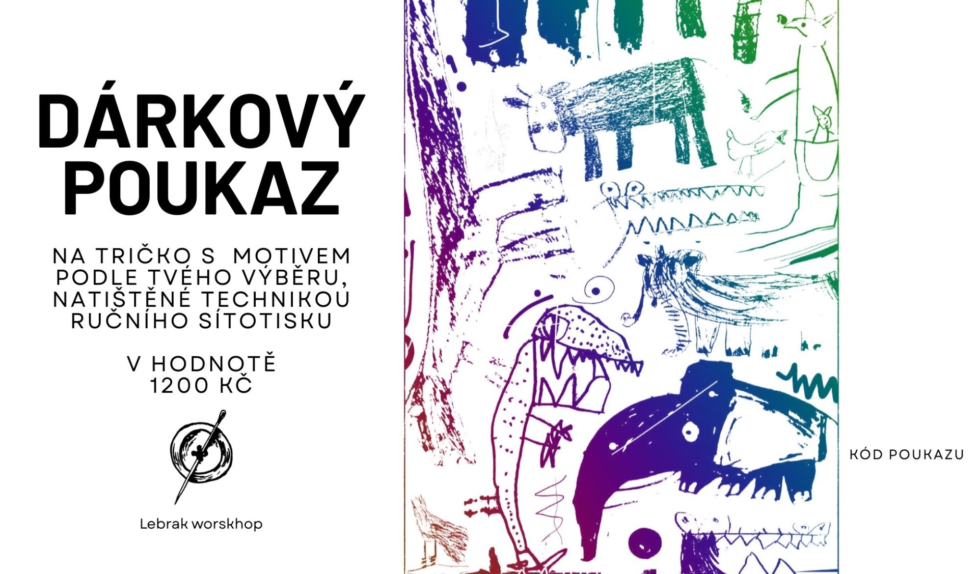 Dárkový poukaz v hodnotě 1000 Kč na tričko potištěné motivem podle vlastního výběru, jak jinak, než technikou ručního sítotisku.
